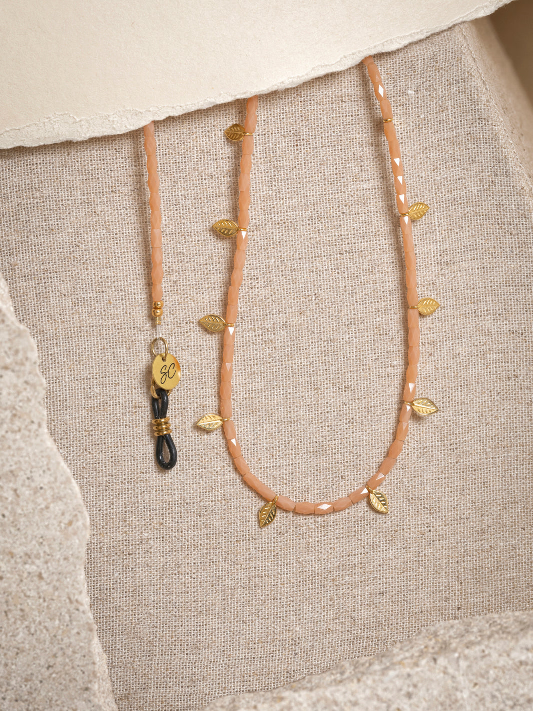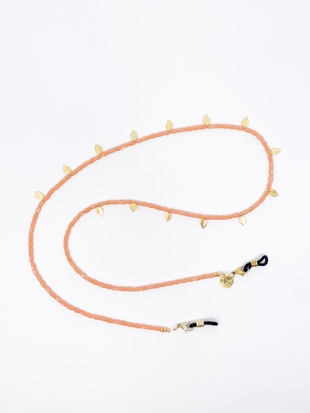Freddy stands for peaceful and that's what this glasses chain looks like, right? This sunny cord with subtle golden feathers is strung with faceted beads, choose between the colours peach or bright blue. The black rubbers make it easy to attach the chain to your (sun)glasses, so you always have your favourite eyewear at hand.