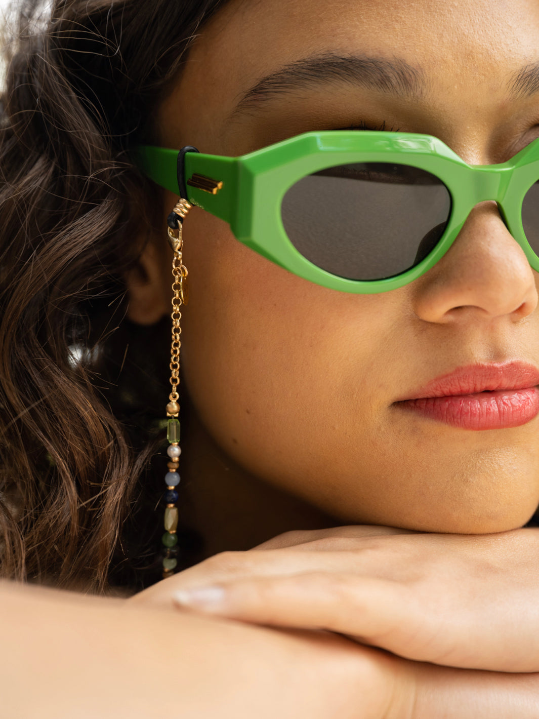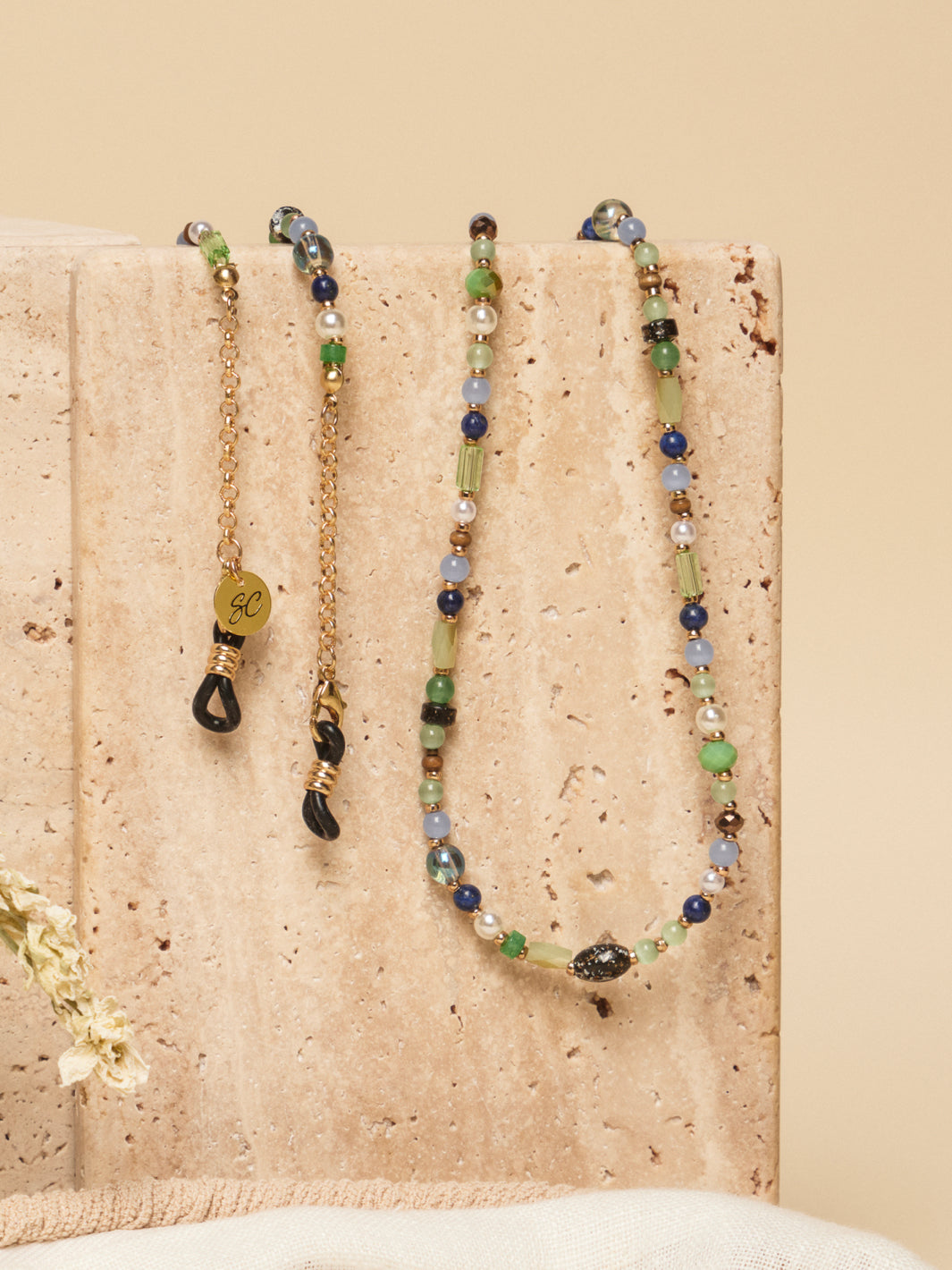 The Stella is our colourful glasses chain that has been defined by a small string of golden chain on both ends. This Sunny Cord has been designed using different types of colourful beads and stones, alternated by a subtle golden pearl. We are such a fan of this design that we designed it in two different colours. Are you opting for the brown one with a touch of pink? Or do the turquoise colours suit better on your (sun)glasses?